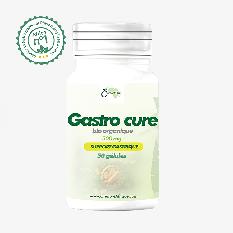 Gastro Cure associe curcumine, piperine et vitamines pour apaiser les troubles gastriques (brûlures, ballonnements) et cicatriser la muqueuse intestinale. 50 gélules bio, fabriquées au Cameroun.